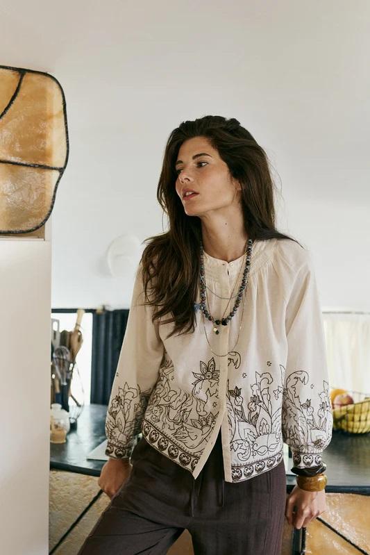 Una blusa con bordado floral que aporta textura y detalle. Su tejido natural y su forma relajada la hacen perfecta para llevar sola o como sobrecamisa.