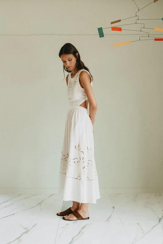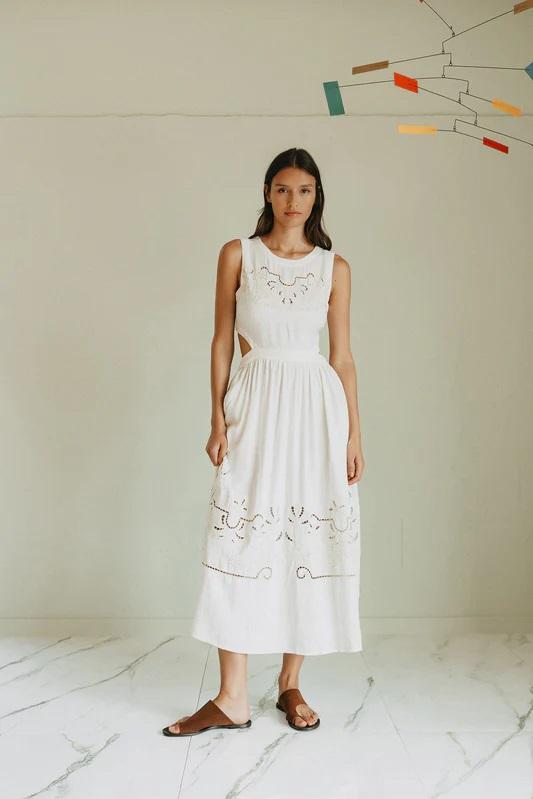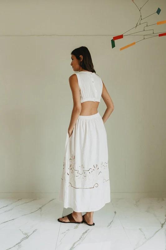 Este vestido refleja la ligereza del verano con una silueta favorecedora, tejido fluido y detalles bordados que lo llenan de encanto. Espalda semidescubierta con botones como abertura.