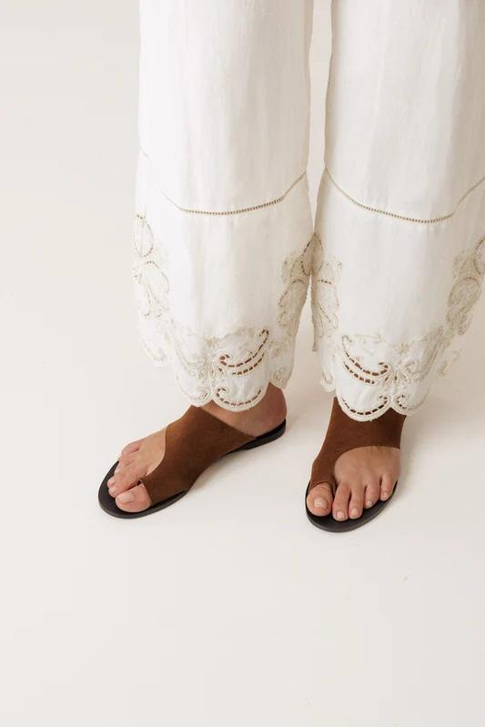 Un pantalón especial por sus detalles. El bordado del bajo y el acabado ondulado, aportan un aire romántico a una prenda cómoda. Ideal para elevar cualquier look sin perder sencillez.