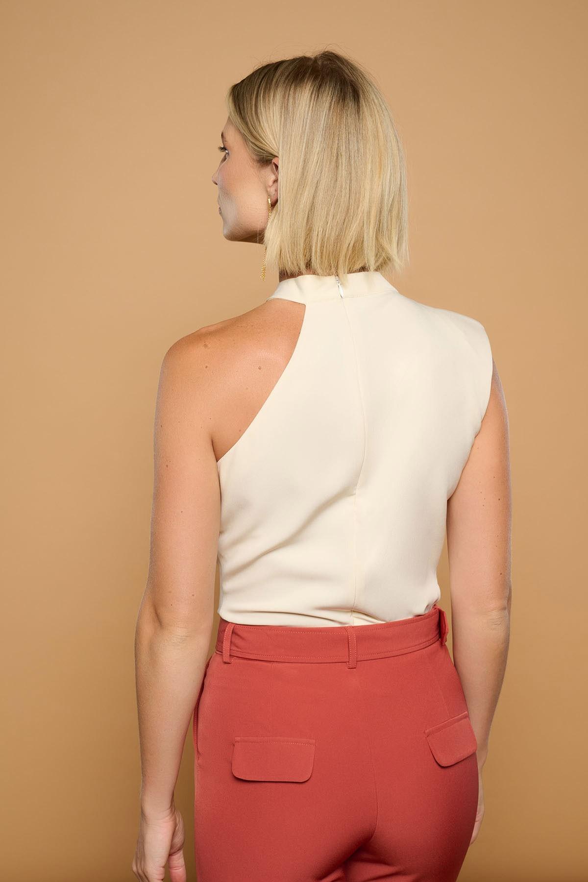 Top de cuello halter con hombros asimétricos. Manga sisa con hombrera y hombro descubierto. Cierre con cremallera lateral.