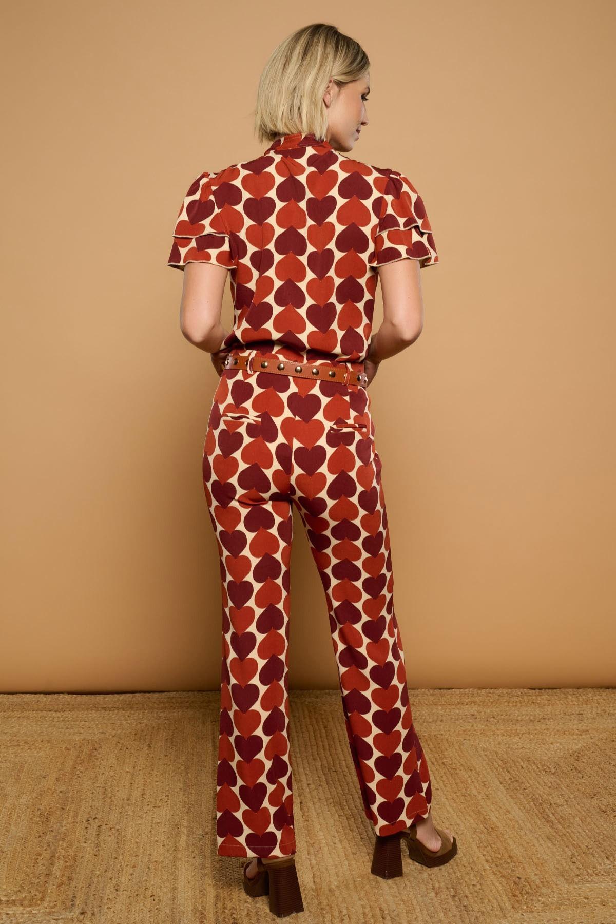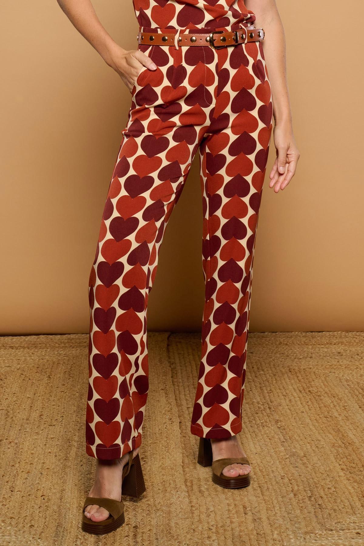 Pantalón de tiro medio. Estilo sastre con pernera recta. Estampado retro de corazones geométricos. Cierre con botón y cremallera frontales. Bolsillos laterales.