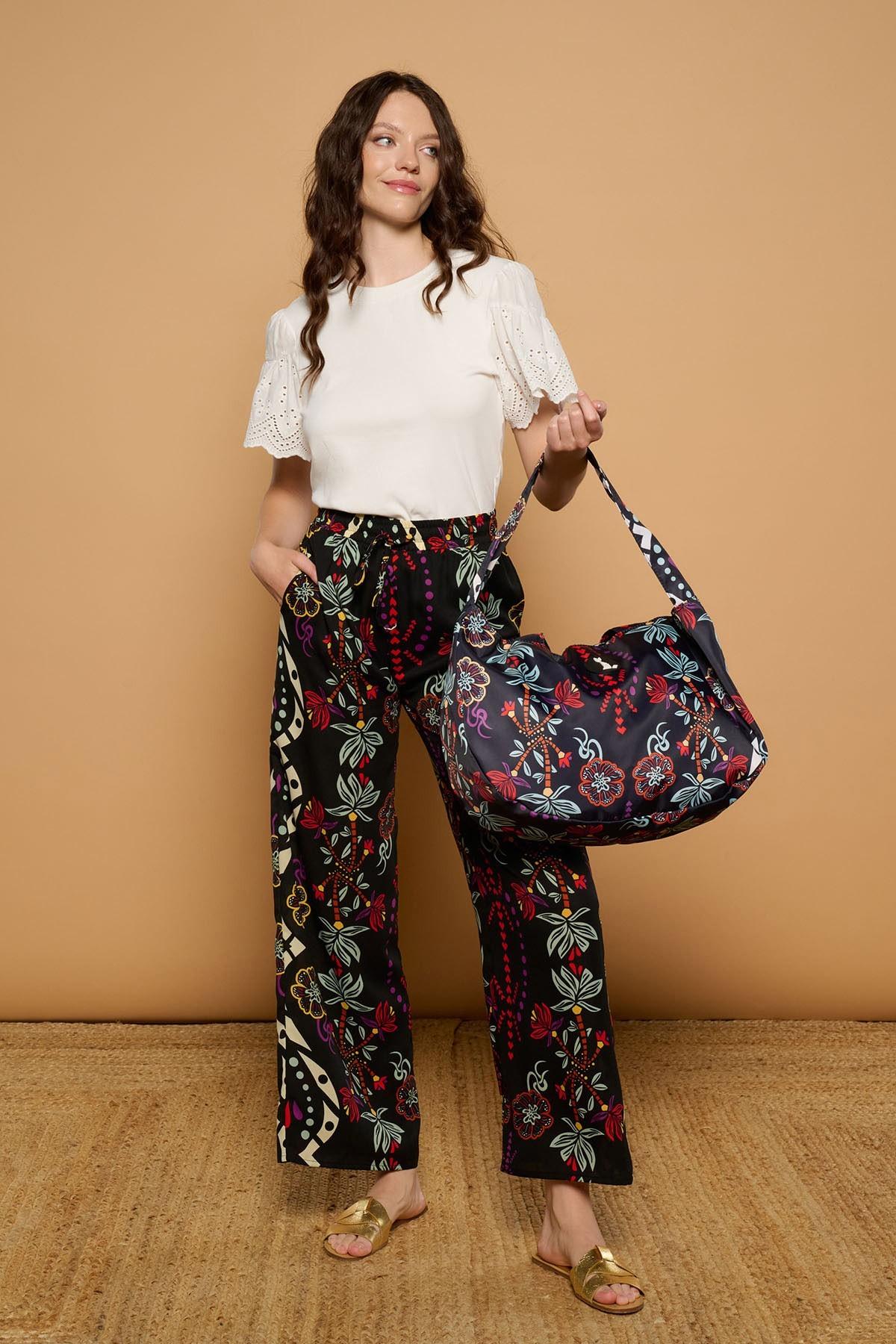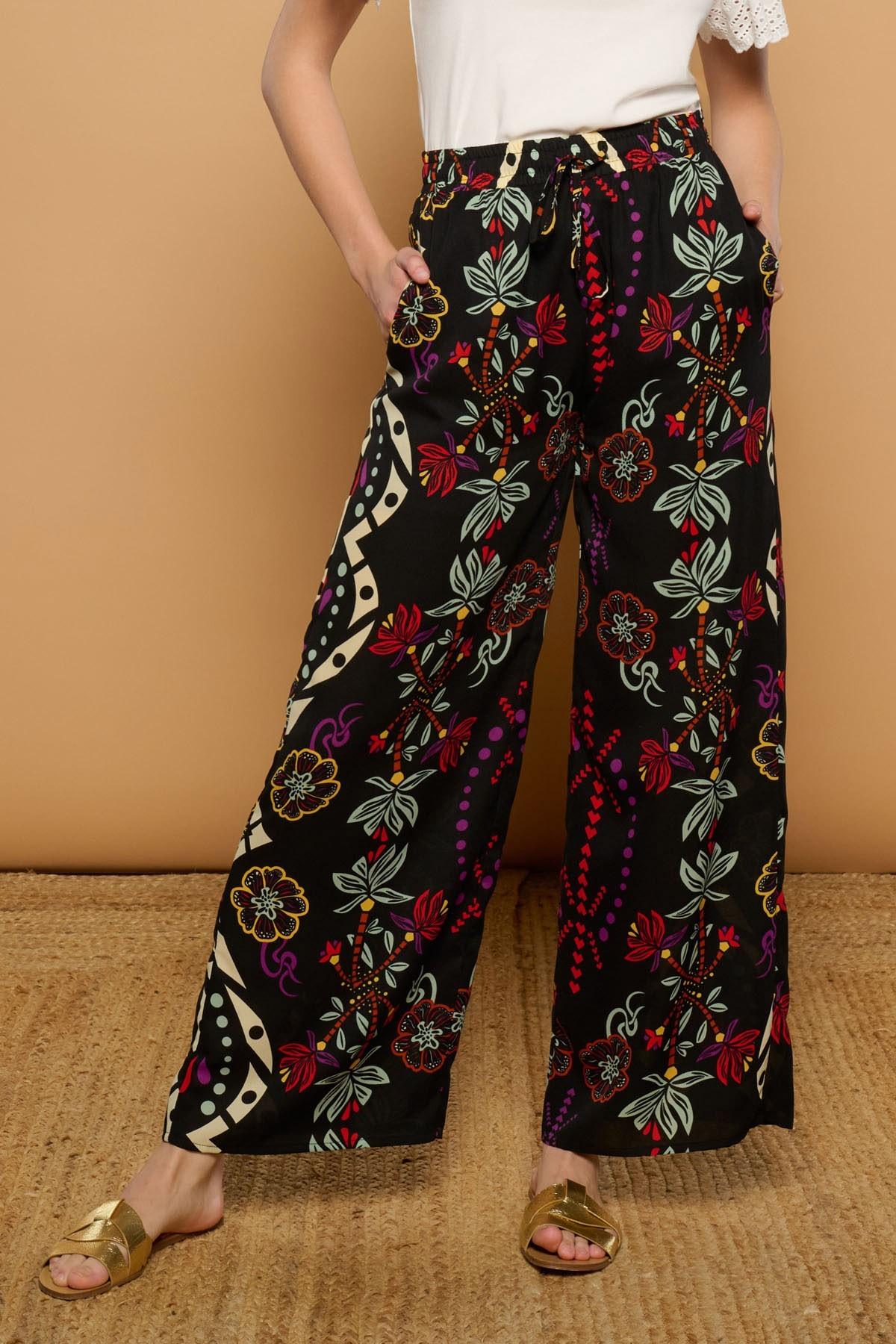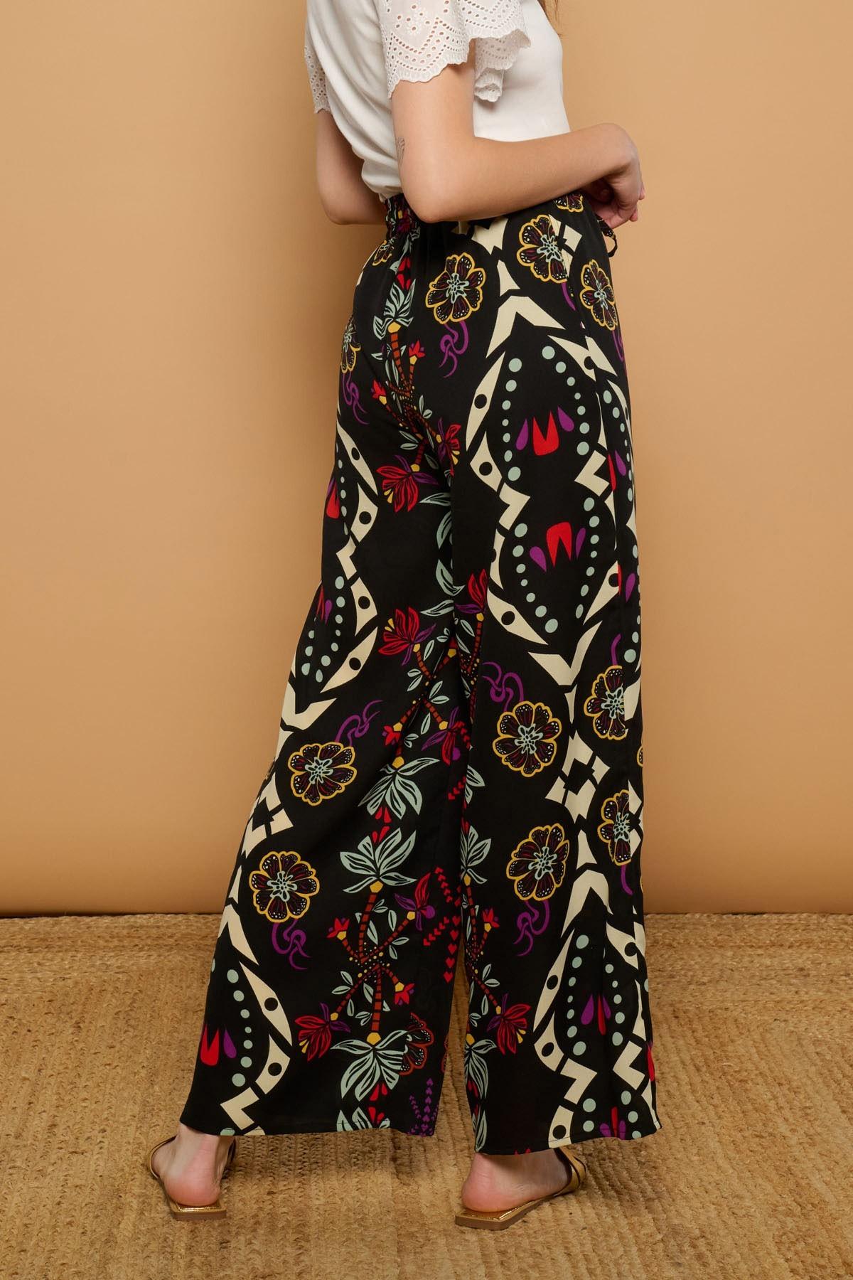 Pantalón de tejido fluido de tiro medio y pernera ancha. Estampado boho. Cintura elástica ajustable con lazada. Bolsillos laterales.