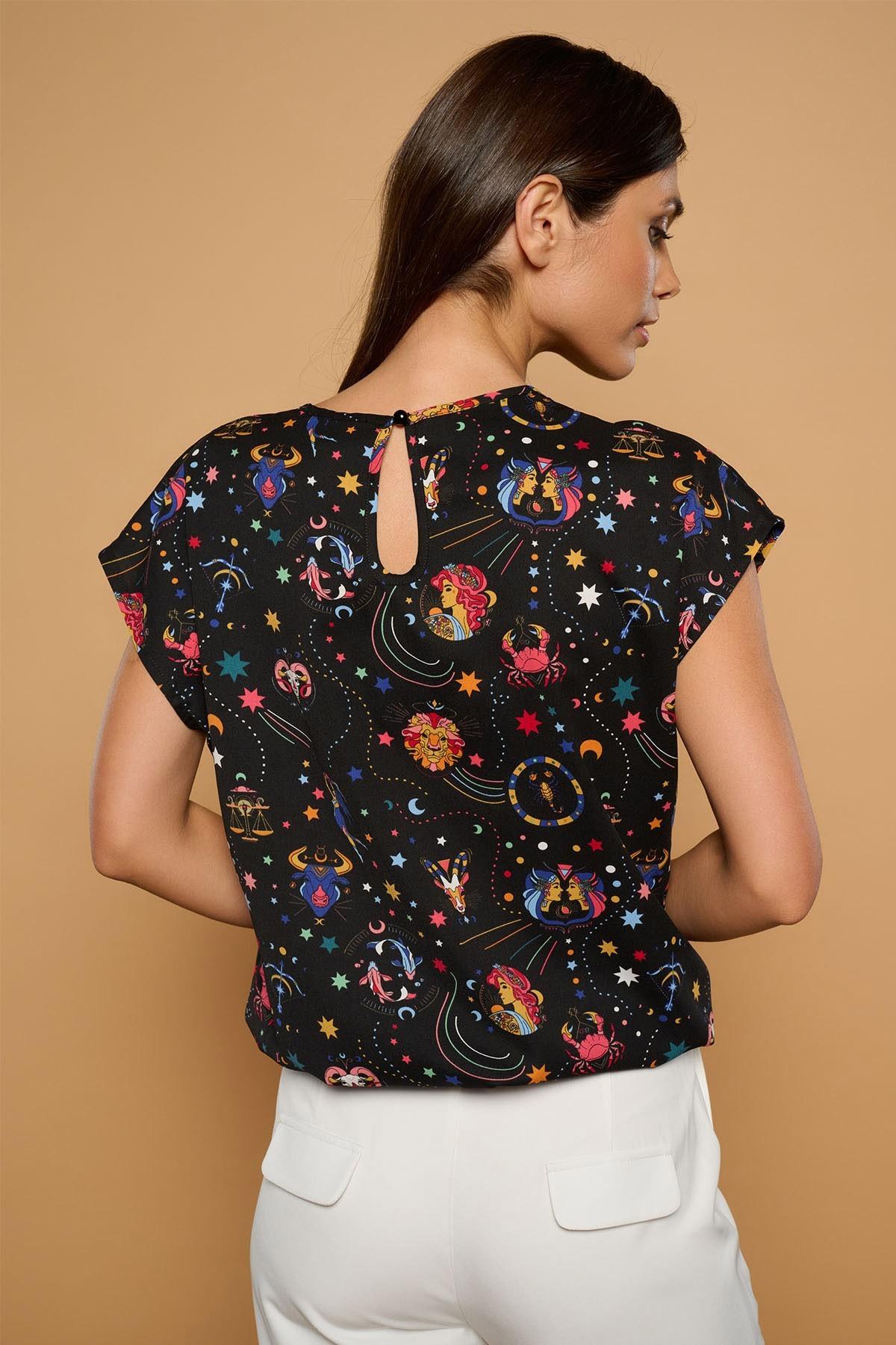 Camiseta de cuello redondo amplio y manga corta. Cierre con botón en espalda. Estampado zodiaco.