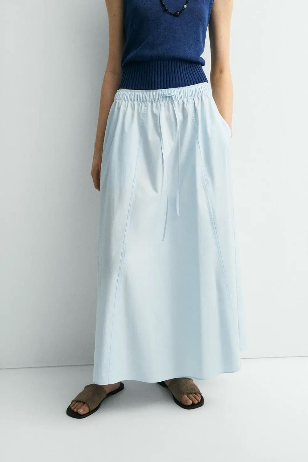 La falda Bubble es una prenda evasé confeccionada en tejido ligero, en un tono azul claro que aporta delicadeza y movimiento.