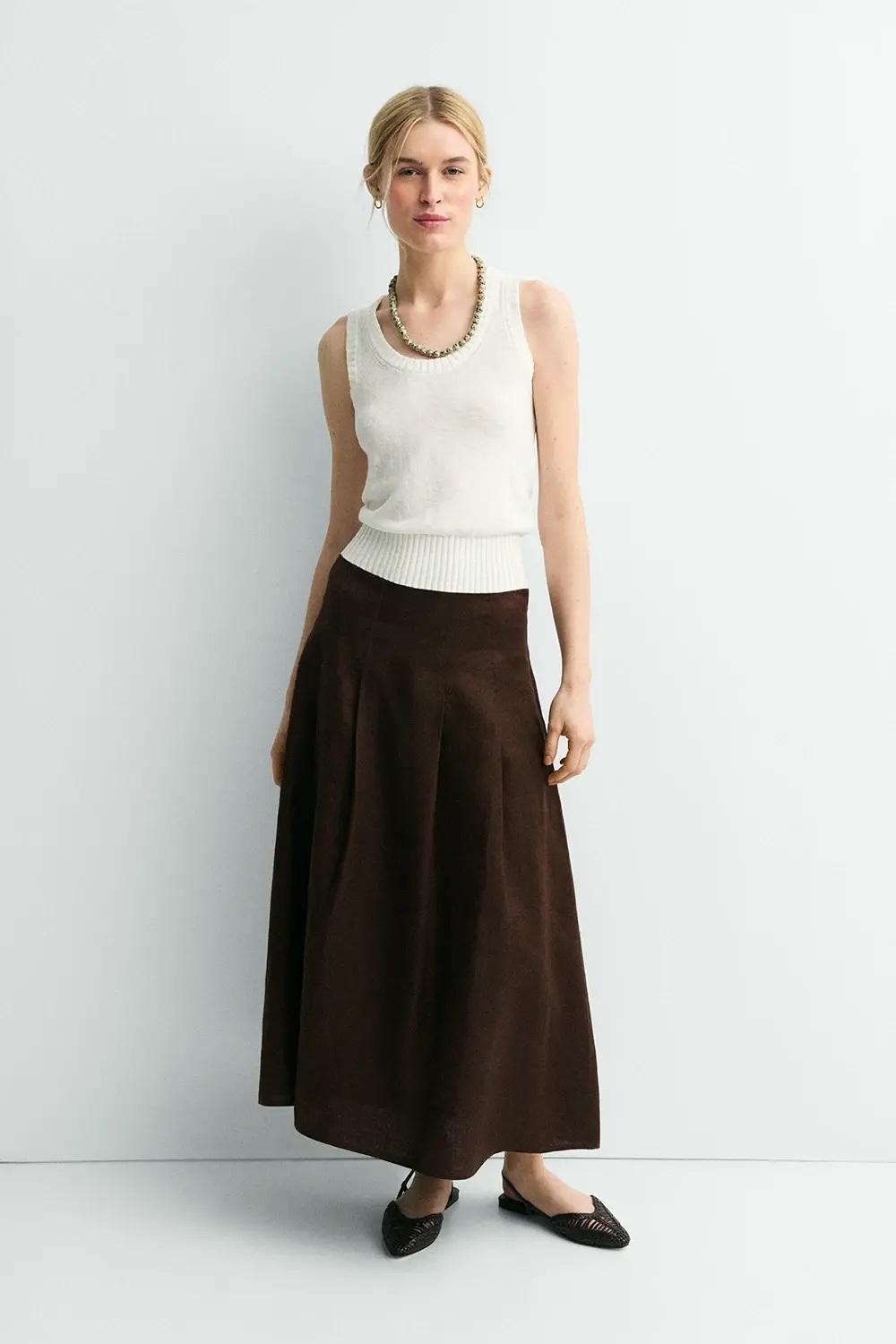 La falda Rania es una prenda de tablas confeccionada en twill de lino, que combina estructura y ligereza en color chocolate.