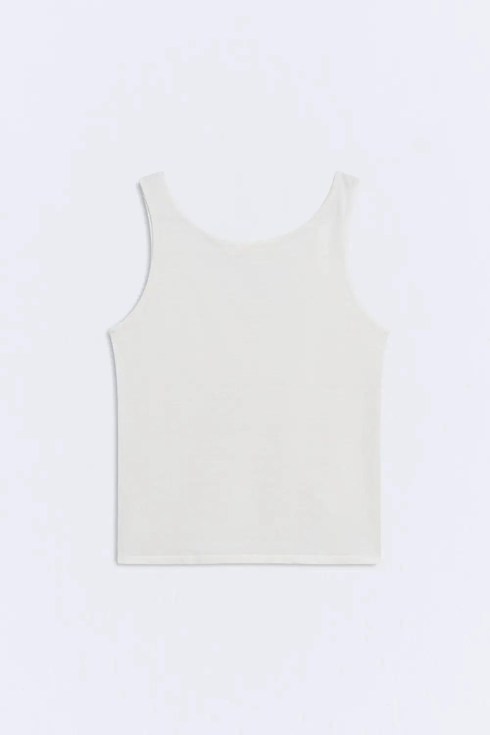 El top Nefora es una prenda ligera confeccionada en 100% lino de tejido fino (galga fina), ligeramente transparente, en color beige.