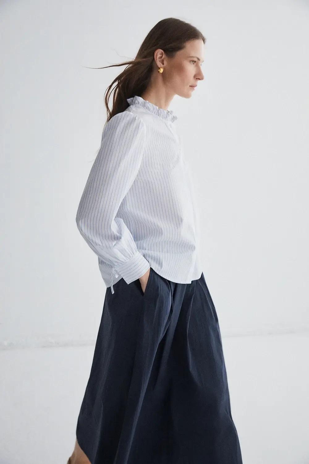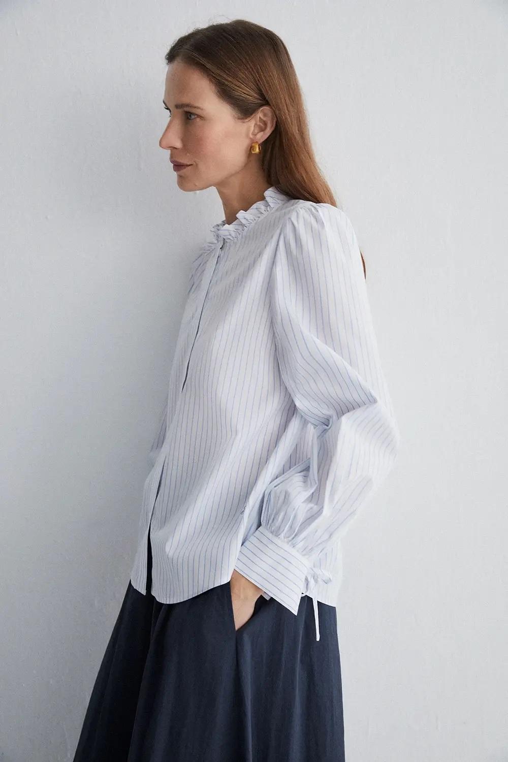 - Con volante en el cuello y puños.