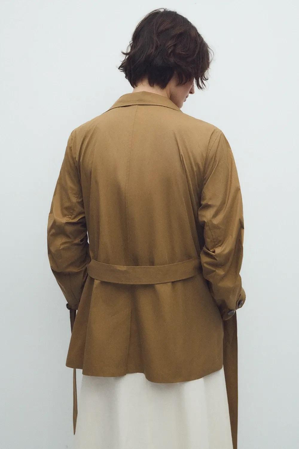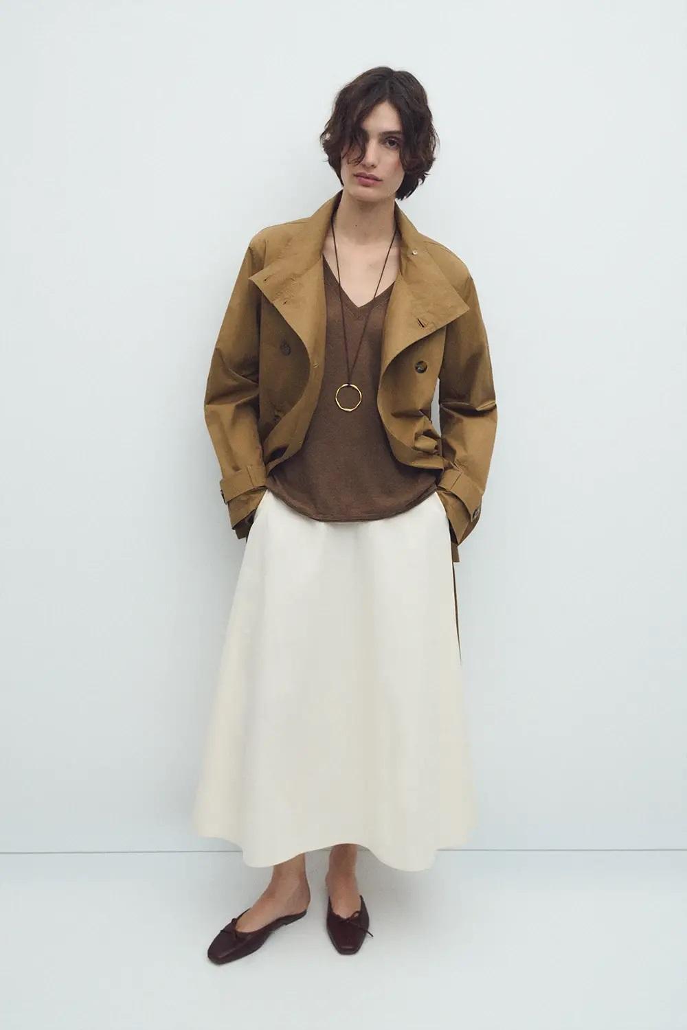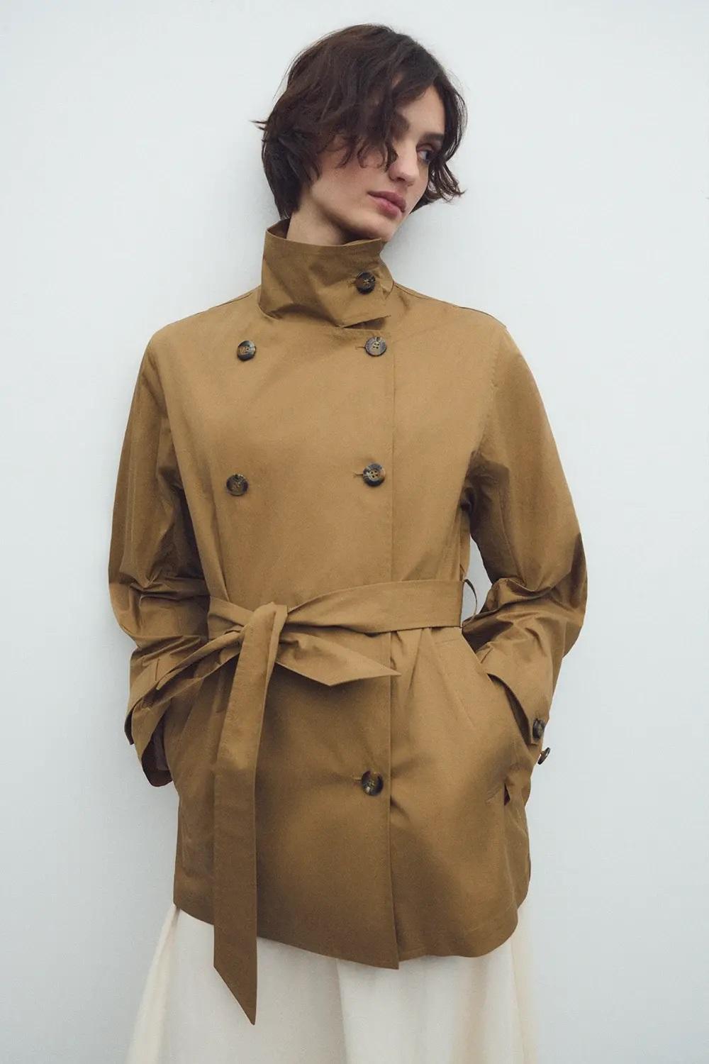 Trench midi de doble abotonadura con cuello alto.