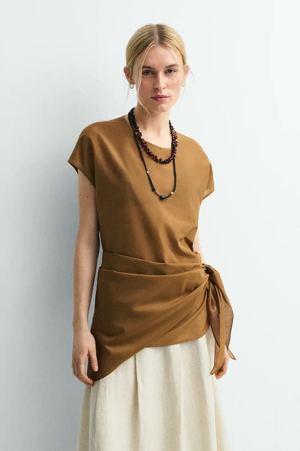 Diseñada con manga corta caída y cuello barca con abertura en la espalda, ofrece una silueta femenina y elegante. Incluye un pañuelo a conjunto, perfecto para llevarlo en la cintura o alrededor del cuello.