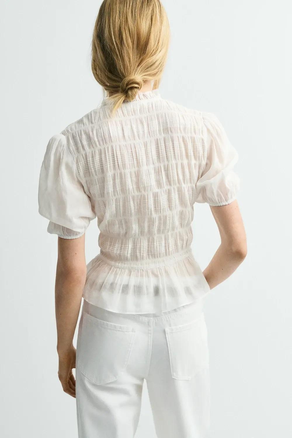 Diseñada con manga corta abullonada, cuello volante y cierre con botones, presenta un volante en el bajo que aporta un aire romántico y femenino. Su silueta delicada y su tejido suave combinan comodidad y estilo, creando un look elegante y actual en color blanco. El tejido es ligeramente transparente.