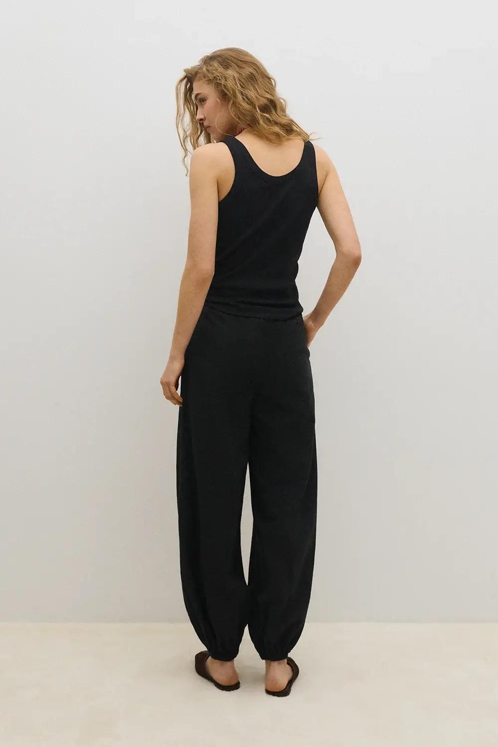El pantalón Luxor es una prenda de tiro medio confeccionada en tejido suave y cómodo en color negro.