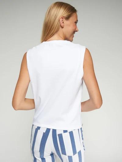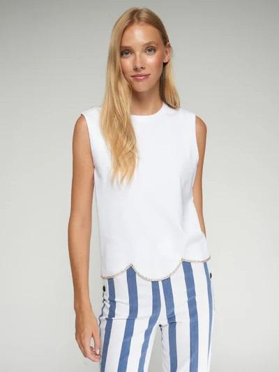Top sin mangas en color blanco con bajo ondulado rematado con detalle brillante. Presenta cuello redondo