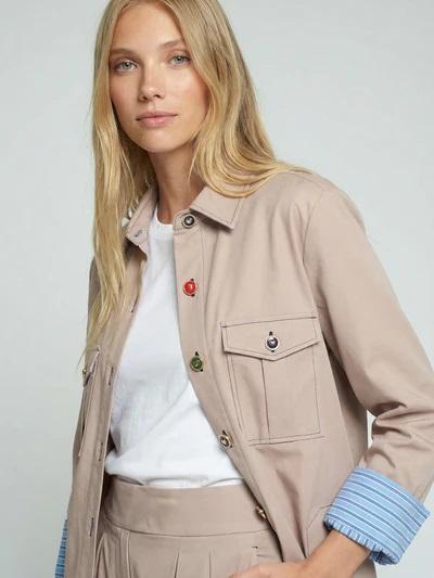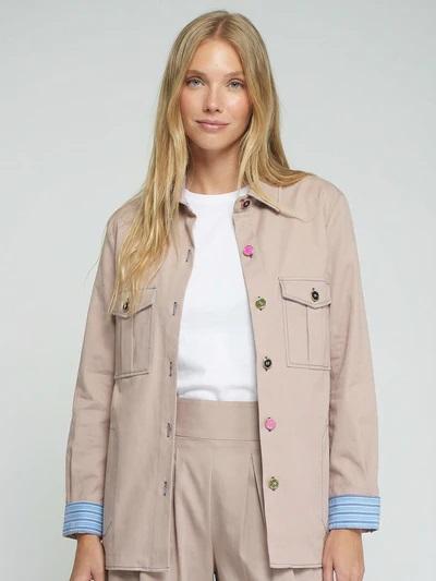 Chaqueta beige con cuello camisero con dos bolsillos superiores con tapa y dos bolsillos aplicados en la parte inferior. Los puños muestran un contraste de rayas celestes y blancas.