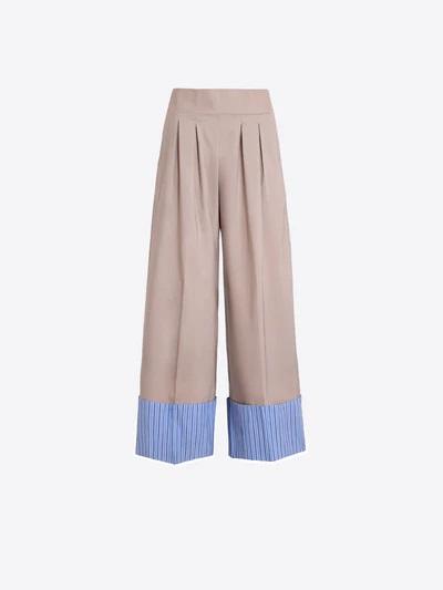 Pantalón beige ancho con pinzas frontales. Cintura lisa y bajo vuelto en tejido de rayas celestes. Bolsillos laterales.