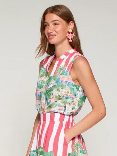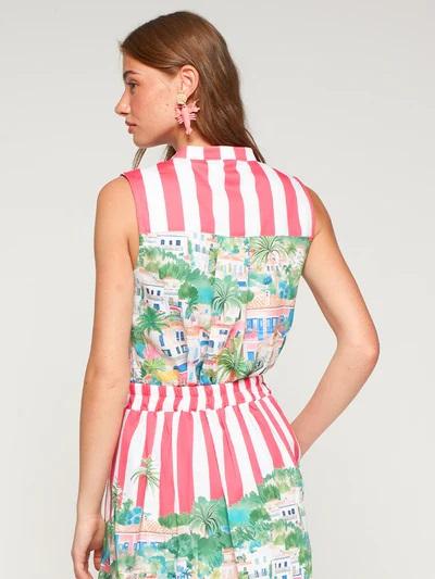 Camisa sin mangas estampado Puerto Banús con ilustración de casas, palmeras y embarcaciones y fondo de rayas rosas y blancas. Escote en V, cierre frontal con botones visibles y bajo redondeado.