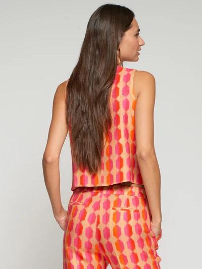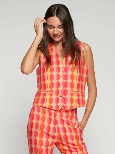 Chaleco con estampado geométrico en tonos rosa, fucsia y naranja. Escote en pico y cierre frontal con botones metálicos. Bolsillos de vivo en el delantero y bajo acabado en pico. Silueta entallada.