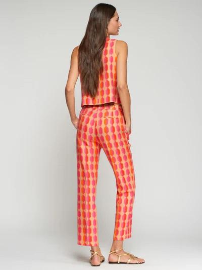 Pantalón de corte recto con estampado geométrico en tonos fucsia, rosa y naranja. Cintura lisa con cierre de botón.