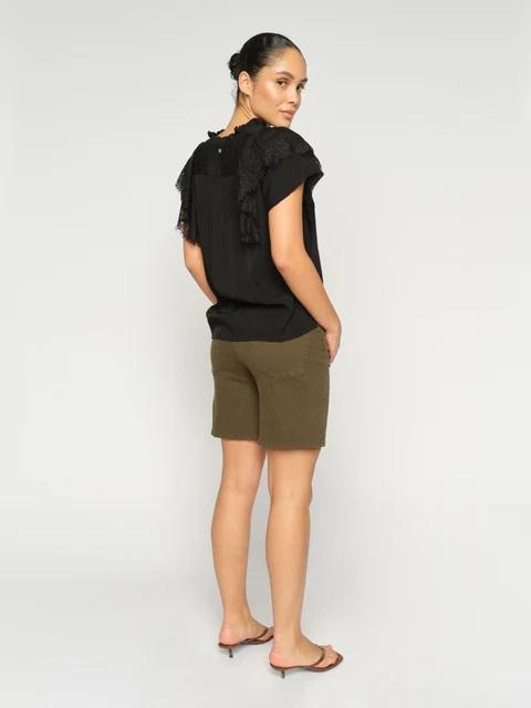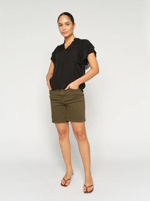 Estos shorts atemporales tienen un favorecedor tiro alto y una silueta regular. Están confeccionados en una suave mezcla de algodón con un toque de elasticidad para mayor comodidad. Cuentan con el clásico detalle de cinco bolsillos y un acabado impecable. Perfectos para los días soleados, combinados con una camiseta metida por dentro o una blusa ligera para un look elegante y desenfadado.